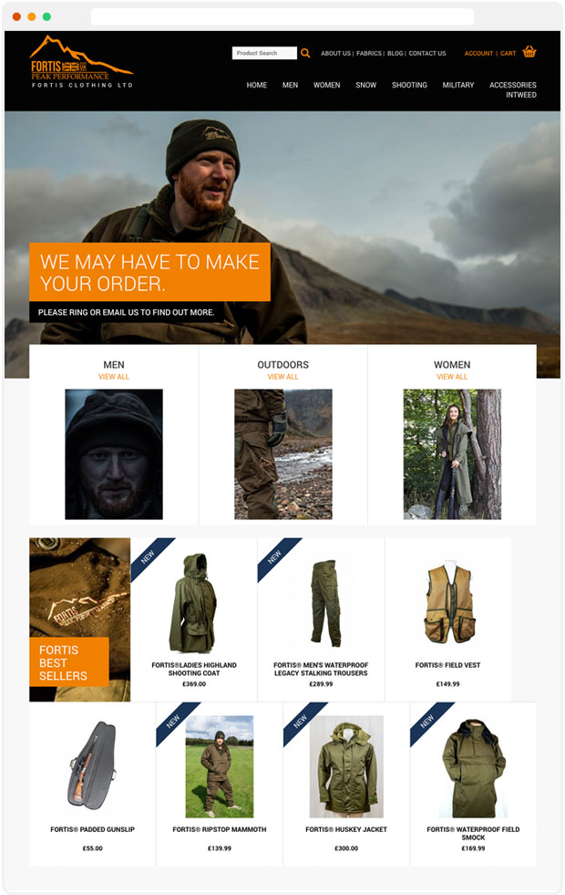 An online outdoor clothing shop for the UK & EU markets focusing on product quality and visual details. The website is aimed at both the general public and the armed forces allowing for individual and bulk orders.