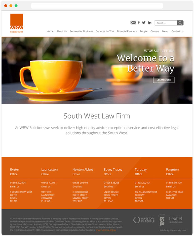 It was imperative for users to easily find the content they require easily and efficiently. WBW Solicitors provide a wide range of legal services for both businesses and the general public. A mega-menu, search bar, quick links and portal areas were integrated into the website. Similarly, there are multiple points of contact for WBW, including a quick call back form, social media integration, email contacts, all supplemented with a list of phone numbers for each South West office. The overall design is in keeping with WBW’s branding, continuing with their striking orange colour and complemented with charcoal.